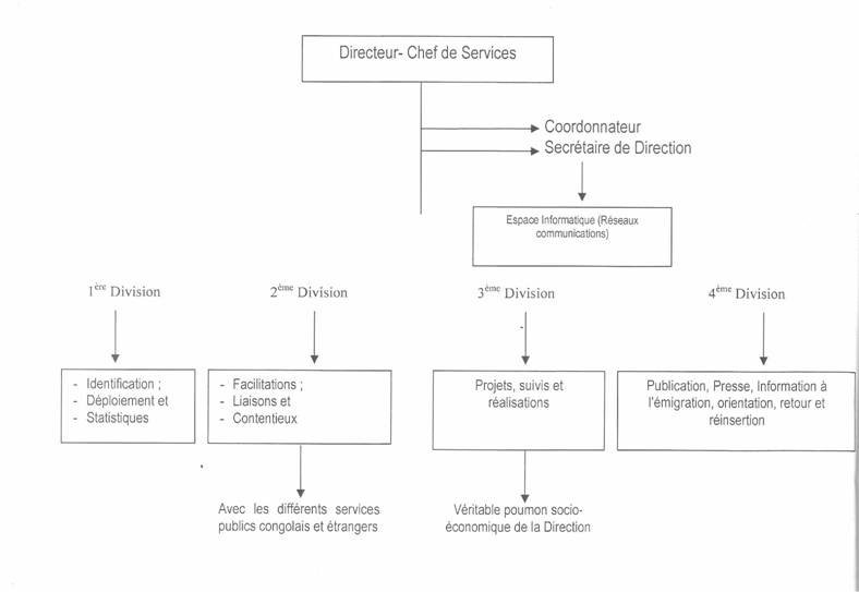 Le Directeur-Chef de Services supervise ct coordonne l'ensemble des activités et des services de la Direction chargée des congolais de l'étranger.