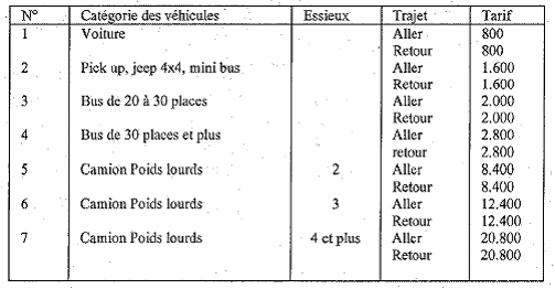 Arrêté ministériel n° CAB/MIN-ITPR 007/MT/2010 du 09 février/2010 portant fixation des taux des droits de péage sur l'axe routier de la RN3 Kisangani - Lubutu, Le Ministre des Infrastructures; Travaux publics et Reconstruction, Vu la Constitution de la République ; Vu la Loi n° 08/006 du 07 juillet 2008 portant création d'un Fonds National d'Entretien Routier, en sigle «FONER» ; Vu l'Ordonnance n" 08/067 du 26 octobre portant nomination des Vice-Premiers Ministres, Ministres et Vice-ministres; Vu l'Ordonnance n° 71-078 du 26 mars 1971 portant classification des routes en République Démocratique du Congo; Vu l'Ordonnancé n° 08/73 du 24 décembre 2008 portant organisation et fonctionnement du Gouvernement, modalités pratiques de collaboration entre le Président de la République et le Gouvernement ainsi qu'entre les membres du Gouvernement, spécialement en son article 19 ; Vu l'Ordonnance n° 08/74 du 24 novembre 2008 fixant les attributions des Ministères; Attendu que l'entretien, la maintenance des routes d'intérêt général ainsi que l'organisation du péage sont de la compétence du Gouvernement central; Vu l'Arrêté interministériel n° 09/CAB/MIN- ITPR/002/KM/2009 du 06 mars 2009, n° CAB/FINANCES/DTS/2009 du 06 mars 2009, n° 001/CAB/MIN/ECONAT/&COM/2009 du 06 mars 2009 et 409/CAB/MIN/TVC/2009 du 06 mars 2009, portant fixation des taux, montants et modalités de perception des ressources du Fonds National d'Entretien Routier, en sigle FONER» spécialement en ses articles 13, 14, 15, 16 et 17; Etant donné que les droits de péage existent sur l'axe routier RN3 Kisangani -Lubutu ; Attendu que l'axe routier Kisangani-Lubutu exige du Gouvernement de la République un entretien; Attendu qu'il sied l'd'assurer l'entretien permanent et ordonné dudit axe; Vu la nécessité et l'urgence; ARRETE Article 1 : Il est institué des droits de péage pour tout véhicule empruntant l'axe routier de la RN3 /Kisangani- Lubutu. Article 2 : Les taux des droits de péage sur l'axe routier de la RN3 Kisangani-Lubutu sont fixés par catégorie des véhicules conformément au tableau repris en annexe au présent Arrêté. Article 3 : Sont exemptés du paiement des droits de péage: 1. les ambulances et les véhicules de lutte contre l'incendie; 2. les véhicules faisant office des corbillards; 3. les véhicules de l'administration des ponts et chaussées et des services publics ayant la construction et l'entretien dans leur objet; 4. les véhicules militaires et de la Police Nationale; 5. les véhicules de toute entreprise de génie civil ayant une activité directe sur la route concernée 6. les véhicules officiels; 7. les cyclomoteurs et les vélos. Article 4 : Toutes les dispositions antérieures et contraires sont abrogées. Article 5 : Le Directeur général du Fonds National d'Entretien Routier en sigle « FONER» est chargé de l'exécution du présent Arrêté qui entre en vigueur à partir de la date de sa signature. Fait à Kinshasa, le 09 février 2010 Pierre Lumbi Okongo Annexe I