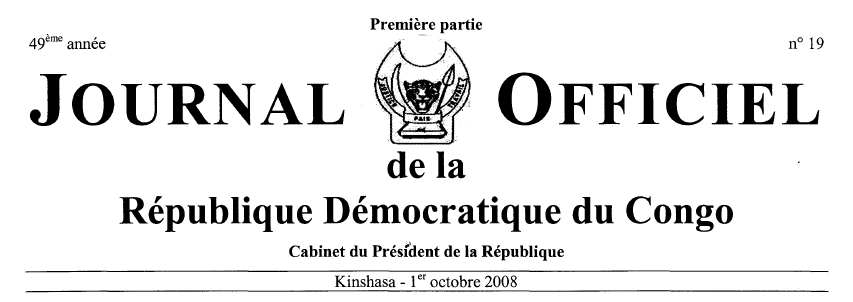 SOMMAIRE PRESIDENCE DE LA REPUBLIQUE 12 septembre 2008 - Ordonnance n° 08/054 portant prorogation de la durée d'exécution du Programme National de Sécurisation, Pacification, Stabilisation et Reconstruction des Provinces du NordKivu et du Sud-Kivu, dénommé « Programme AMANI », col. 5. 24 septembre 2008 - Ordonnance n° 08/059 portant autorisation des modifications aux statuts de ma société par actions à responsabilité limitée dénommée Shell RDC, col. 5. GOUVERNEMENT Ministère de l'Intérieur, Décentralisation et Sécurité; 09 octobre 2006 - Arrêté ministériel n° 112/2006 portant enregistrement d'un parti politique, col. 6. 05 septembre 2007 - Arrêté ministériel n° 064/2007 portant enregistrement d'un parti politique, col. 7. 09 juin 2008 - Arrêté ministériel n° 021/2008 portant enregistrement d'un parti politique, col. S. 26 août 2008 - Arrêté ministériel n° 1457/2008 portant enregistrement d'un parti politique, col. 9. Ministère de la Justice et Droits Humains 19 juin 2008 - Arrêté ministériel n° 026 /CAB./MIN/J&DH/2008 rapportant l'Arrêté ministériel n° 0173/CAB/MIN/JI2007 du 10 août 2007 abrogeant les Arrêtés n° 388/CAB/MIN/J/2006 du 27 septembre 2006 et n° l25/CAB/MIN/JI2007 du 23 février 2007 du 24 janvier 2007 tout en réhabilitant l'Arrêté n° 017/CAB/MIN/2007 du 24 janvier 2007, col. 10. 10 juillet 2008 - Arrêté ministériel n° 041/CABIMIN/J&DH/2008 portant abrogation de l'Arrêté n° 013/CAB/MIN/J&DH/2008 du 28 mars 2008 accordant la personnalité juridique à l'association sans but lucratif confessionnelle dénommée «Victory Church of Congo» en sigle « V.C.O.C. », col. 11. 17 juillet 2008 - Arrêté ministériel n° 046/CAB/MIN/J&DH/2008 accordant la personnalité juridique à l'association sans but lucratif confessionnelle dénommée « Congrégation des Soeurs de Charité de Notre Dame du Bon er Perpétuel Secours» en sigle "C.S.C.N.D.B.P.S.", col. 12. 02 février 2007 - Arrêté ministériel n° 048/CAB/MIN/J/2007 accordant la personnalité juridique à l'association sans but lucratif confessionnelle dénommée «Eglise Pentecôtiste Unie » en sigle «E.P.U. », col. 13. 24 juillet 2008 - Arrêté ministériel n° 056/CAB/MIN/J&DH/2008 accordant la personnalité juridique à l'association sans but lucratif non confessionnelle dénommée «Association Vie Saine et Développement » en sigle «A.V.S.D. », col. !4. 14 août 2008 - Arrêté ministériel n° 068/CAB/MIN/J&DH/2008 approuvant la nomination des personnes chargées de l'administration ou de la direction de l'Asbl confessionnelle dénommée « Communauté des Eglises Bibliques Indépendantes en Afrique'» en sigle «CEBIA », col. 15. 14 août 2008 - Arrêté ministériel n°072/CAB/MIN/J&DH/2008 accordant la personnalité juridique 'à l'association sans but lucratif confessionnelle dénommée « Eglise du Christ de l'Alliance au Congo » en sigle « ECAC », col. 16. 14 août 2008 - Arrêté ministériel n° 074/CAB/MIN/J&DH/2008 accordant la personnalité juridique à l'association sans but lucratif non confessionnelle dénommée «Aide et Solidarité pour l' AfriqueCongo ))~n sigle «ASA-Congo », col. IS. 14 août 2008 - Arrêté ministériel n° 075/CAB/MIN/J&DH/2008 accordant la personnalité juridique à l'association sans but lucratif confessionnelle dénommée «Centre de Réveil Biblique Emmanuel Shammah», en sigle « CRBES-Asbl », col. 19. 14 août 2008 - Arrêté ministériel n° 079/CAB/MIN/J&DH/2008 accordant la personnalité juridique à l'association sans but lucratif non confessionnelle dénommée « Carrefour des Jeunes Ingénieurs et Ecologistes pour le Rebatissement du Congo » en sigle « CAJIERCO », col. 20. 14 août 2008 - Arrêté ministériel n° 081/CABIMIN/J&DH/200S accordant la personnalité juridique à l'association sans but lucratif non confessionnelle dénommée «Cité Evangélique de la Main de l'Eternel » en sigle «CEMET)), col. 21. 21 août 2008 - Arrêté ministériel n° 082/CAB/MIN/J&DH/2008 accordant la personnalité juridique à l'association sans but lucratif e non confessionnelle dénommée «Association des Parents d'Elèves et d'Etudiants Protestants de la RDC)) en sigle "APEP", col. 22. 21 août 2008 - Arrêté ministériel n° O83/CAB/MIN/J&DH/2008 accordant la personnalité juridique à l'association sans but lucratif confessionnelle dénommée « Eglise du Salut par le Christ » en sigle « ESPO), col. 24. 21 août 2008 - Arrêté ministériel n° 084/CAB/MIN/J&DH/2008 accordant la personnalité juridique à l'association sans but lucratif non confessionnelle dénommée «Centre National pour le Développement et l'Autosuffisance Alimentaire » en sigle "CEDEALI", col. 25. 21 août 2008 - Arrêté ministériel n° 085/CABIMIN/J&DH/2008 accordant la personnalité juridique à l'association sans but lucratif non confessionnelle dénommée «The Voice of Woman/La Voix de la Femme » en sigle "V.W.", col. 26. IS septembre 2008 - Arrêté ministériel n° 112/CAB/MIN/J&DH/ 200S approuvant les modifications apportées à certains articles des statuts et la nomination des personnes chargées de la direction ou de l'administration de l'association sans but lucratif dénommée «Eglise Chrétienne Union du Saint-Esprit-Mpeve ya Longo » en sigle "ECUSE", col. 27. Ministère des Transports et Voies de Communication 15 août 2008 - Arrêté ministériel n° 409/CAB/MIN/TVC/0013/2008 portant désignation des membres du comité directeur provisoire de la Commission Nationale de Prévention Routière en sigle «CNPR », col. 29. Ministre de la Fonction Publique 29 juillet 2008 - Arrêté n° CAB.MIN/FP/LSIL/CA-SDB/085/2008 portant désignation à titre intérimaire aux emplois de commandement des agents de carrière des services publics de l'Etat de la. Présidence de la République Direction Générale du Journal officiel de la République Démocratique du Congo, col. 30. 29 juillet 2008 - Arrêté n° CAB.MIN/FP/