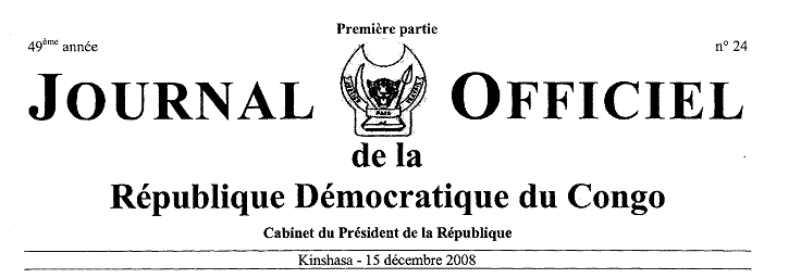 SOMMAIRE GOUVERNEMENT Ministère de la Culture et des Arts et Ministère des Finances, 28 novembre 2008- Arrêté interministériel n°016/CAB/MIN/CA/ 2008 et n°277 /CAB/MIN/FINANCES/ 2008 modifiant l'Arrêté interministériel n° 251CAB/MIN/CA/13112005 et n°064/CAB/MIN/FINANCES/2005 du 28 juin 2005 portant fixation des taux des droits, taxes et redevances à percevoir à l'initiative du Ministère de la Culture et des Arts, col. 7. Ministère de la Justice et Droits Humains, 10 octobre 2006 - Arrêté ministériel n° 563/CAB/MIN/J/2005 accordant la personnalité juridique à l'association sans but lucratif confessionnelle dénommée «Eglise Mission Prophétique par les Eglises Ngunza » en sigle «MI.PRO.NG. », col. 14. 13 février 2008 - Arrête ministériel n° 0001/CAB/MIN/J&DH/ 2008 accordant la personnalité juridique à l'association sans but lucratif confessionnel dénommé «Communauté des Assemblées Chrétiennes Tabernacles du Congo » en sigle« CACTC », col. 15. 25 juin 2008 - Arrêté ministériel n° 038/ CAB/ MIN/ J& DH/ 2008 accordant la personnalité juridique à l'association sans but lucratif non confessionnelle dénommée « Bureau d'Etude d'Elaboration et d'exécution des programmes et Projets de Développement », en sigle « BEPROD », col. 16. 14 août 2008 - Arrêté ministériel n° 070/CAB/ MIN/ J& DH/ 2008 accordant la personnalité juridique à l'établissement d'utilité publique dénommé «Fondation Kasereka Kasai pour la Reconstruction du KIVU », en sigle «KASKAS », col. 17. 20 septembre 2008 - Arrêté ministériel n° 120/ CAB/ MIN/ J& DHl2008 accordant la personnalité juridique à l'association sans but lucratif non confessionnelle dénommée «Association Femme Action Développement, en sigle « AF AD », col. 19. 29 septembre 2008 - Arrêté ministériel n° 127/ CAB/ MIN/ J& DH/2008 approuvant la modification apportée aux statuts et la nomination des personnes chargées de la direction de l'association sans but lucratif dénommée «Centre Evangélique la Présence de Dieu », en sigle « CEPD ), col. 20. 29 septembre 2008 - Arrêté ministériel n° 143/ CAB/ MINI J& DH/2008 accordant la personnalité juridique à l'association sans but lucratif non confessionnelle dénommée «Association pour la Protection des Minorités au Congo) en sigle « APROMIC », col. 21. 29 septembre 2008 - Arrêté ministériel n° 147/ CAB/MIN/ J& DH/2008 accordant la personnalité juridique, à l'association sans but lucratif non confessionnelle dénommée «Agence pour le Développement Intégré au Congo », en sigle« ADIC », col. 23. 29 septembre 2008 - Arrêté ministériel n° 154/ CAB/ MIN/ J& DH/2008 accordant la personnalité juridique à l'association sans but lucratif confessionnelle dénommée «Eglise de Siloé pour Délivrance et Sanctification du Temps de la Fin », en sigle «Eglise Siloél DSTF ), col. 24. 18 octobre 2008 - Arrêté ministériel n° 169/ CAB/MIN/ J& DH/2008 accordant la personnalité juridique à l'association sans but lucratif non confessionnelle dénommée «Service d'Appui au Développement Régional Intégré», en sigle« SADRI », col. 25. 18 octobre 2008 - Arrête ministériel n° 171/ CAB/ MIN/ J& DH/2008 accordant la personnalité juridique à l'association sans but lucratif non confessionnelle dénommée «Action Citoyenne pour la Bonne Gouvernance », en sigle« ACBG », col. 27. 18 octobre 2008 - Arrêté ministériel n° 172/ CAB/ MIN/ J& DH/ 2008 accordant la personnalité juridique à l'association sans but lucratif non confessionnelle dénommée «Université de la Foi en Christ », en sigle « UFC », col. 28. 18 octobre 2008 - Arrêté ministériel n° 173/ CAB/ MIN/ J& DH/ 2008 accordant la personnalité juridique à l'association sans but lucratif non confessionnelle dénommée «Chaleur Humaine pour Tous », en sigle « CHT », col. 30. 18 octobre 2008 - Arrêté ministériel n° 174/ CAB/ MIN/ J& DH/ 2008 accordant la personnalité juridique à l'association sans but lucratif non confessionnelle dénommée «Action Communautaire pour le Développement Durable », en sigle « ACODEVD », col. 31. 18 octobre 2008 - Arrêté ministériel n° 178/ CAB/ MIN/ J& DH/2008 accordant la personnalité juridique à l'association sans but lucratif non confessionnelle dénommée «Association Groupant des Orphelins, Enfants de la Rue, Abandonnés et Filles mères de Luluabourg », en sigle « AGROBELU », col. 32. 23 octobre 2008 - Arrêté ministériel n° 179/ CAB/ MIN/ J& DH/2008 approuvant les modifications apportes aux statuts et la nomination des personnes chargées de l'administration ou de la direction de l'asbl non confessionnelle dénommée «Fonds Médical de Coordination », en sigle« FOMECO », col. 33. 23 octobre 2008 - Arrêté ministériel n° 183/ CAB/ MIN/ J& DH/ 2008 accordant la personnalité juridique à l'association sans but lucratif non confessionnelle dénommée «Centre d'Etude et de Formation Populaire », en sigle« CEFOP », col. 34. Ministère des Affaires Foncières, 18 juin 2008 - Arrêté ministériel n° 077/CAB/MIN/AFF.FONC/ 2008 portant annulation de l'Arrêté ministériel n° 117 /CAB/MIN/ AFF .FONC/PKM/2007 du 30 août 2007 et du contrat d'emphytéose relatif à la parcelle n° 1011 S.R Village Kigala 1, Territoire de Kasangulu, Province du Bas-Congo, col. 36. 09 juillet 2008 - Arrêté ministériel n° 081/CAB/AFF.FONC/AFF. FONC/2008 portant création d'une parcelle de terre n° 53.847 à usage agricole du plan cadastral de la Commune de Mont-Ngafula, Quartier Mitendi, Ville de Kinshasa, col. 37. 09 juin 2008 - Arrêté ministériel n° 083/CAB/MIN/AFF.FONC/ 2008 portant création des parcelles numéros 1050 et 1052 à usage agricole du plan cadastral de Kwilu Ngongo, Territoire de MbanzaNgungu, Province du Bas-Congo, col. 39. 31 juillet 2008 - Arrêté ministériel n° 095/CAB/MIN/AFF. FONC/2008 portant création d'une parcelle de terre n° 4569 à usage agricole du plan