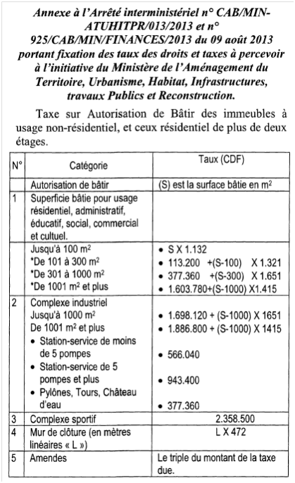 Vu l'Arrêté ministériel n° CAB/MINATUHITPR/007/2013 du 26 juin 2013 portant règlementation de l'octroi du permis de construire en République Démocratique du Congo ;
