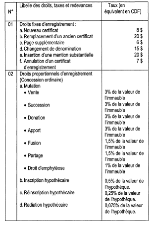 Arrêté interministériel n° 003/CAB/MIN/AFF. FONC/2013 et n°/CABIMIN/FINANCES/2013/854 du 03 juillet 2013, portant fixation des taux des droits, taxes et redevances à percevoir à l'initiative du Ministère des Affaires Foncières.
