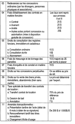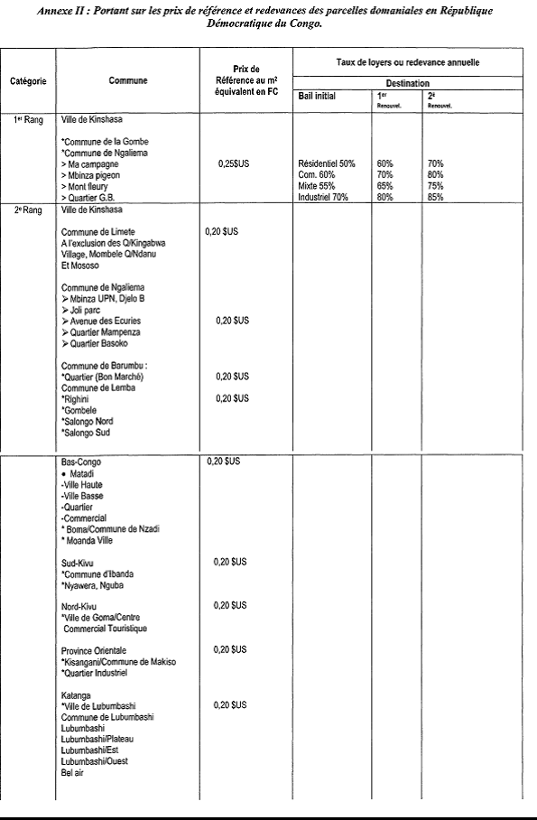 Les taux des droits, taxes et redevances des parcelles domaniales à usage résidentiel, commercial, industriel, mixte et agropastoral situées dans les circonscriptions foncières de la République Démocratique du Congo, mises ou à mettre sur le marché conformément à la procédure organisée par l'article 4 de l'Ordonnance n° 74-148 du 02 juillet 1974 portant mesures d'exécution de la Loi n° 73/021 du 20 juillet 1973, telle que modifiée et complétée à ce jour, sont fixés suivant les annexes I, II et III du présent Arrêté.