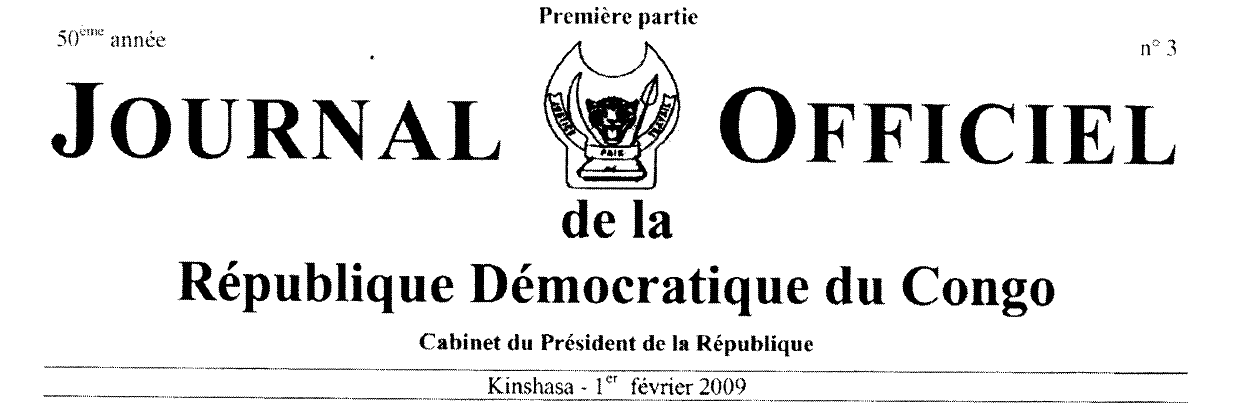 17 novembre 2008 - Arrêté interministériel n° 002/CAB/MIN/FINANCES/2008 et n°008/CAB/MIN- ECON AT& COM/2008 portant dispositions particulières applicables à l'importation du ciment gris, col. 10. Ministère des Hydrocarbures, 07 janvier 2009 - Arrêté ministériel n° 002/CAB/MIN/HYDRO/RIN/2009 portant création d'une commission chargée de l'examen et de l'exécution de la recommandation de l'Assemblée nationale n° 0064/RD/AN/CP/VK/2008 du 12 juillet 2008 relative la gestion du secteur des Hydrocarbures en République Démocratique du Congo, col, 11. Ministère des .Affaires Sociales, Action Humanitaire et Solidarité Nationale, 4 octobre 2008 - Arrêté ministériel 097/CAB/MIN/AFF.SAH/SN/08 accordant autorisation provisoire de fonctionnement à l'association sans but lucratif dénommée "Fondation Docteur Lepriya", col 13. Ministère de l'Environnement, Conservation de la Nature et Tourisme 23 janvier 2009 - Arrêté ministériel n° 090/CAB/MIN/ECN.T/15/JEB/2009 portant mesures de mise en oeuvre des décisions de rejet des requêtes de conversion et de résiliation des anciens titres forestiers, col. 14. Ministère des .Affaires .Foncières 14 septembre 2007 - Arrêté ministériel n° 127/CAB/MIN/ AFF.FONGCC/SMM/2007 portant déclaration. d'un bien sans Maître et reprise au domaine privée de l'Etat de la parcelle n° 556 du plan cadastral de la Commune de Limete (avenue Zinnias. 10e rue/quartier résidentiel), Ville Province de Kinshasa, col, 19.. 04 octobre 2007 - Arrêté ministériel n° 136/CAB/MIN.AFF..FONC/SEC/PKM/2007 portant déclaration d'un bien sans Maître et reprise au domaine de l'état de la parcelle n°698 du plan cadastral de la Commune de Limete, 16e me,. Ville de Kinshasa, col. 21 22 janvier 2009 - Arrêté ministériel n n° 006 CAB/MIN.AFF..FONC/2009 portant nomination et affectation des agents de commandement dans les circonscriptions foncières de Kinshasa, coli 22.