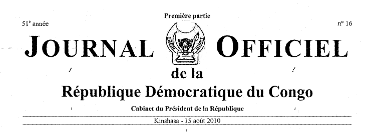 SOMMAIRE PRESIDENCE DE LA REPUBLIQUE 11 février 2010 - Loi n° 10/003 autorisant la ratification du Pacte de Défense Mutuelle signé le 26 août 2003 à Dar-Es-Salam par les états membres de la Communauté de Développement de l'Afrique Australe, col. 5. Exposé des motifs, col. 5. Loi, col. 5. 11 février 2010 - Loi n°010/004 autorisant la ratification de la Convention sur la Protection et la Promotion de la Diversité des expressions culturelles, col. 5. Exposé des Motifs, col. 5. Loi, col. 6. 11 février 2010 - Loi n° 10/005 autorisant la ratification de la Convention pour la sauvegarde du patrimoine culturel immatériel, col. 6. Exposé des motifs, col. 6. Loi, col. 7. 11 février 2010 - Loi n°10/006 autorisant la ratification de la Convention pour la sauvegarde du patrimoine culturel subaquatique, col. 7. Exposé des motifs, col. 7. Loi, col. 8. 02 mars 1990 - Ordonnance n°90-056 accordant la personnalité civile à l'association sans but lucratif «Institut Africain pour le Développement Économique et Social-Formation Zaïre» , col. 8. 20 août 2010 - Ordonnance n° 10/060 portant approbation de l'Accord de Don n° H555-ZR du 20 mai 2010 conclu entre la République Démocratique du Congo et l'Association Internationale de Développement (IDA) au titre de Projet d'Appui à la Réhabilitation et à la Relance du Secteur Agricole «PARRSA » , col. 9. 20 août 2010 - Ordonnance n° 10/061 portant approbation de l'Accord de Financement n° H552-ZR du 20 mai 2010 conclu entre la République Démocratique du Congo et l'Association Internationale de Développement au titre de financement additionnel au Projet d'Action Sociale d'Urgence « PASU » , col. 1 O. GOUVERNEMENT Cabinet du Vice-Premier Ministre, Ministre de l 'Emploi, du Travail et de la Prévoyance Sociale 17 mars 2010 - arrêté ministériel n° 00l/CAB/PVPM/ETPS/2010 portant approbation un plan social de la REGIDESO et autorisation de sa mise en œuvre, col. 11. 17 mars 2010 - Arrêté ministériel n0002/CABI PVPM/ETPS/2010 portant approbation et autorisation de mise en œuvre du plan de départ en retraite des agents et de la stratégie de règlement des arriérés de salaire des agents à retraiter de la Société National des Chemins de Fer du Congo, SNCC en sigle, col. 12. 23 mars 2010 - Arrêté ministériel n°003/CAB/PVPM/ETPS/2010 portant fixation du barème des primes permanentes des cadres et agents du Programme National pour l'Emploi des Jeunes « PRoYEN/YEN RDC », col. 13. 24 mars 2010 - Arrêté ministériel n°004/CAB/PVPM/ETPS/2010 modifiant l'Arrêté ministériel na 12/CAB.MINI TPS/maa/0991 05 du 05 septembre 2005 portant fixation du barème des primes du personnel du Secrétariat technique pour la Promotion de l'Emploi, col. 15. 01 avri12010 - Arrêté ministériel n°005/CAB/PVPM/ETPS/2010 fixant les modalités de déclaration annuelle de la situation de la main-d'œuvre, col. 19. 01 avril 2010 - Arrêté ministériel n°006/CAB/PVPM/ETPS/2010 fixant les modalités de déclaration d'embauche et de départ d'un travailleur, col. 20. 01 avril 2010 - Arrêté ministériel n°007/CAB/PVPM/ETPS/2010 autorisant le licenciement de cinq travailleurs de l'Ambassade de Belgique, col. 21. 01 avril 2010 - Arrêté ministériel n°008/CAB/PVPM/ETPS/2010 fixant les modalités de déclaration d'ouverture et de fermeture d'établissement ou d'entreprise, col. 22. 02 avril 2010 - Arrêté ministériel n°009/CAB/PVPM/ETPS/2010 autorisant le licenciement des travailleurs de la société de British Cars & Parts Limited sprl, col. 23. 02 avril 2010 - Arrêté ministériel n° 010/CAB/PVPM/ETPS/2010 portant autorisation de licenciement des travailleurs de la société Kibali Goldmines Sprl, col. 24. 02 avril 2010 - Arrêté ministériel n° 012/CAB.MIN/ETPS/IGT/JIB/NDJ 1a/04/2010 portant annulation de la décision n° 022/MTPS/IT/DHK/01/2010 du 07 janvier 2010 de l'Inspecteur provincial du Travail de Kipushi relative au licenciement sans préavis d'un délégué syndical, col. 25. 17 avril 2010 Arrêté Interministériel n° 0011b/CAB.MIN/ETPS/2010 et n° 023/CAB/MIN/FINANCES/2010 portant des taux des droits, taxes et redevances à percevoir à l'initiative du Ministère de l'Emploi, Travail et Prévoyance Sociale, col. 26. 22 avril 2010 - Arrêté ministériel n° 0012/CAB/MIN/PVPM/ETPS/2010 portant création de la Commission de Rédaction de l'Agenda de la République Démocratique du Congo à la réunion des Ministres du Travail de la SADC, col. 28. 18 mai 2010 - Arrêté ministériel n° 0013/CAB/MIN/PVPM/ETPS/2010 portant convocation de la Session extraordinaire du Conseil National de l'Emploi, col. 29. 02 juin 2010 - Arrêté ministériel n° 0014/CAB/MIN/PVPM/ETPS/2010 portant création d'une Commission chargée de la Coordination de la Campagne de vulgarisa ion et de sensibilisation sur les conditions de travail dans les Entreprises, col. 30. 02 juin 2010 - Arrêté ministériel n° 0015/CAB/MIN/PVPM/ ETPS/2010 portant désignation des membres de la Commission chargée de la coordination et supervision de la campagne de vulgarisation et de sensibilisation sur les conditions de travail dans les Entreprises, col. 31. 04 juin 2010 - Arrêté ministériel n° 0016/CAB/MIN/PVPM/ ETPS/2010 portant création, organisation et fonctionnement de la Commission chargée de l'Elaboration de la Politique Nationale de l'Emploi et de la Formation professionnelle, « CEPNEF », en sigle, col. 32. 04 juin 2010 - Arrêté ministériel n° 0017/CAB.MIN/PVPM/ ETPS/2010 portant nomination du Coordonateur de la Commission chargée de l'Elaboration de la Politique Nationale de l'Emploi et de la Formation professionnelle, « CEPNEF », en sigle, col. 34. 05 juin 2010 - Arrêté ministériel n° 0018/CAB/MINIPVPM/ ETPS/2010 portant création de la Commission préparatoire chargée de l'Elaboration et la mise en œuvre d'un pilotage transversal des dimensions sociales de la réforme des Entreprises publiques de la République Démocrat